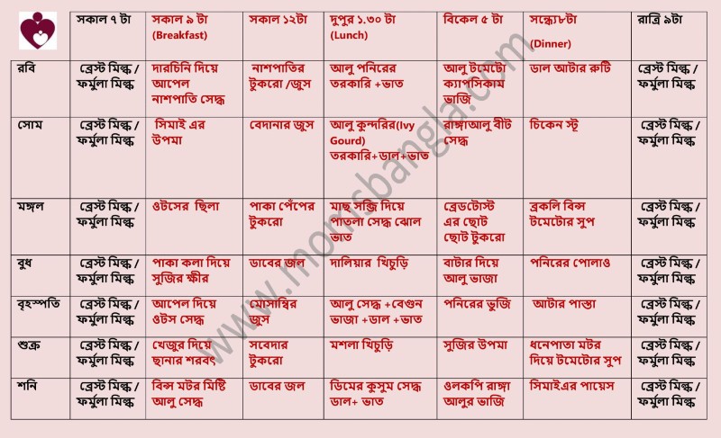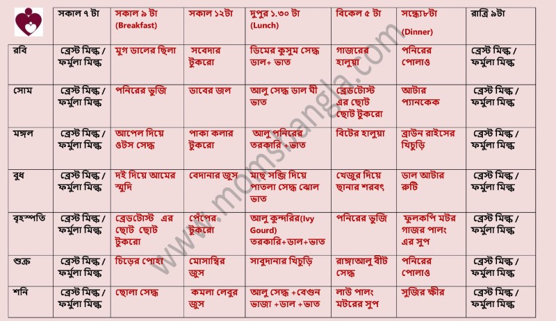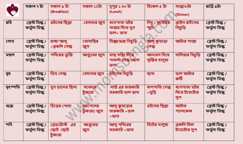 ৯ মাস বয়সী শিশুর খাদ্য তালিকার সময় নির্ঘণ্ট (9 month old baby food chart in Bengali )